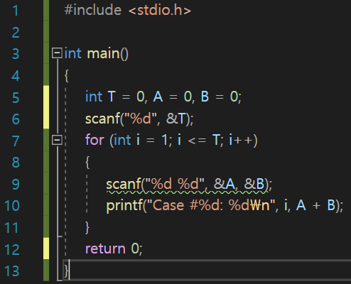 각 테스트 케이스마다 "Case #x: "를 출력한 다음, A+B를 출력한다. 테스트 케이스 번호는 1부터 시작한다.