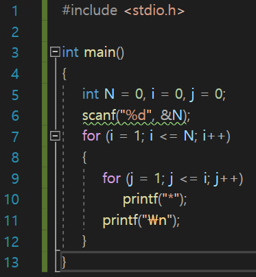 첫째 줄에는 별 1개, 둘째 줄에는 별 2개, N번째 줄에는 별 N개를 찍는 문제