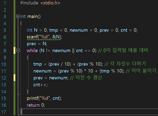 newnum = (prev % 10) * 10 + (tmp % 10); // 이어 붙이기