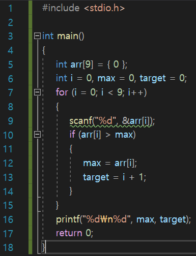 9칸짜리 1차원 배열을 선언해주고, 값을 저장한 다음, 최댓값을 찾아주면 되겠습니다.