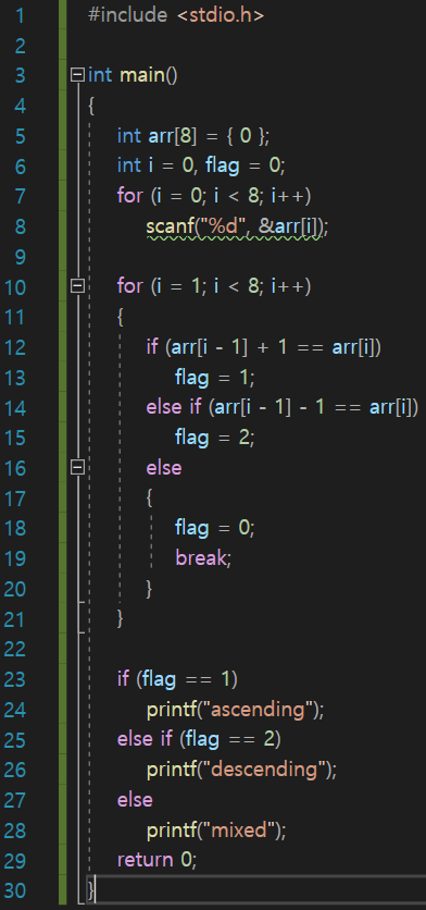 문제 다장조는 c d e f g a b C, 총 8개 음으로 이루어져있다. 이 문제에서 8개 음은 다음과 같이 숫자로 바꾸어 표현한다. c는 1로, d는 2로, ..., C를 8로 바꾼다. 1부터 8까지 차례대로 연주한다면 ascending, 8부터 1까지 차례대로 연주한다면 descending, 둘 다 아니라면 mixed 이다. 연주한 순서가 주어졌을 때, 이것이 ascending인지, descending인지, 아니면 mixed인지 판별하는 프로그램을