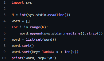 첫째 줄에 단어의 개수 N이 주어진다. (1 ≤ N ≤ 20,000) 둘째 줄부터 N개의 줄에 걸쳐 알파벳 소문자로 이루어진 단어가 한 줄에 하나씩 주어진다. 주어지는 문자열의 길이는 50을 넘지 않는다.