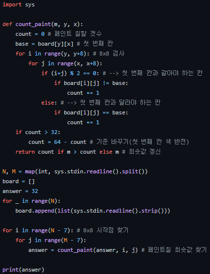 백준 1018 체스판 다시 칠하기 문제를 파이썬으로 풀어보겠습니다.