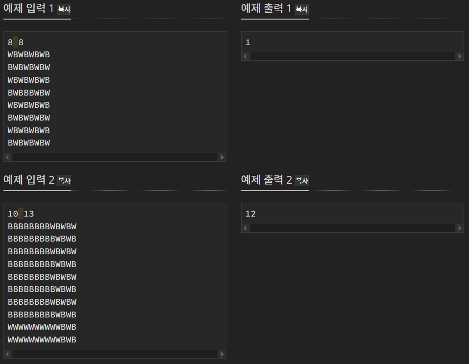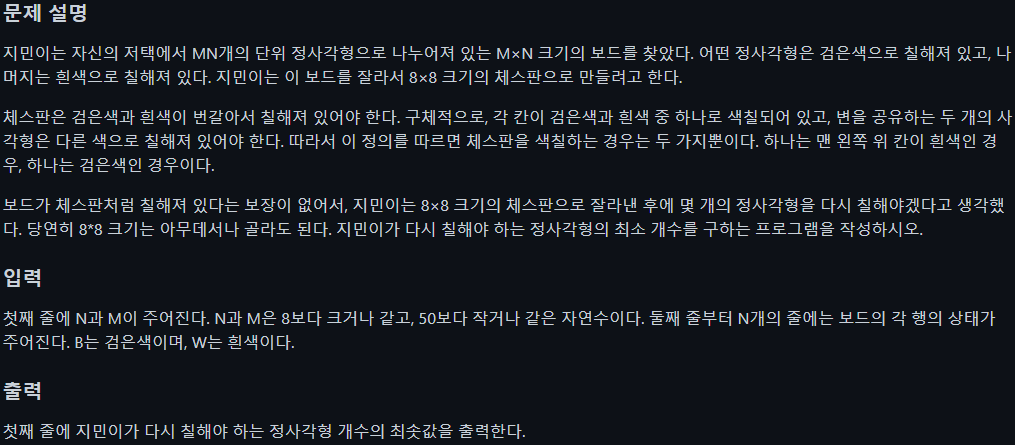 첫째 줄에 N과 M이 주어진다. N과 M은 8보다 크거나 같고, 50보다 작거나 같은 자연수이다. 둘째 줄부터 N개의 줄에는 보드의 각 행의 상태가 주어진다. B는 검은색이며, W는 흰색이다.