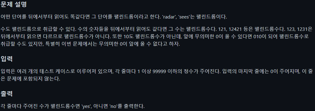 이번 문제는 백준 1259 팰린드롬수 입니다. 회문과 비슷한 문제겠네요. (소주만병만주소 와 같은..)