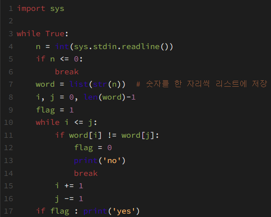 if word == word[::-1]: # 리스트와 리스트(역순)이 같은지 검사