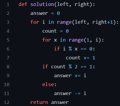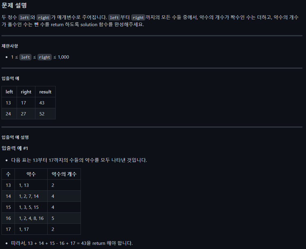 이번엔 프로그래머스 lv1 77884번 약수의 개수와 덧셈 문제를 파이썬으로 풀어보겠습니다.