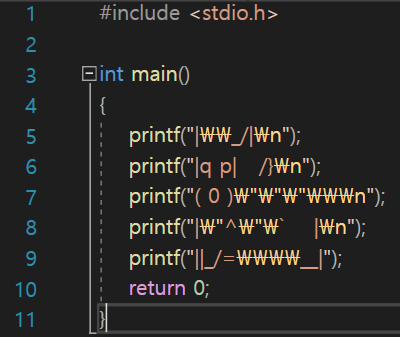문제 아래 예제와 같이 개를 출력하시오. 입력 출력 예제 입력 1 복사 예제 출력 1 복사 |\_/| |q p| /} ( 0 )"""\ |"^"` | ||_/=\\__|...